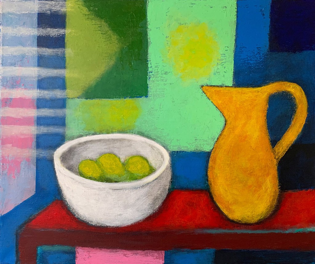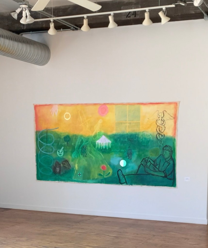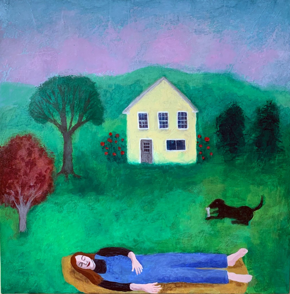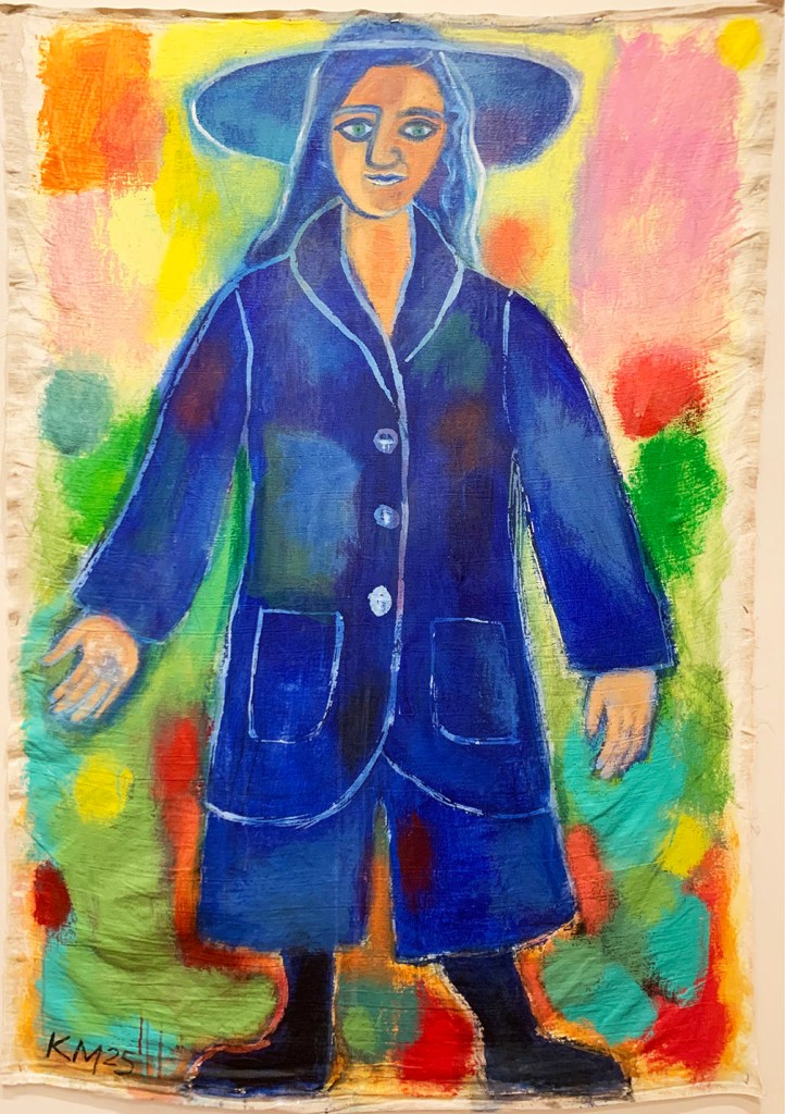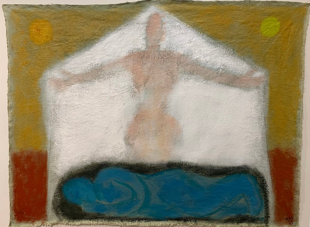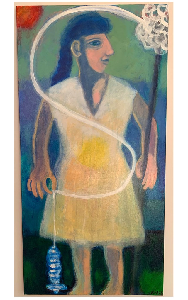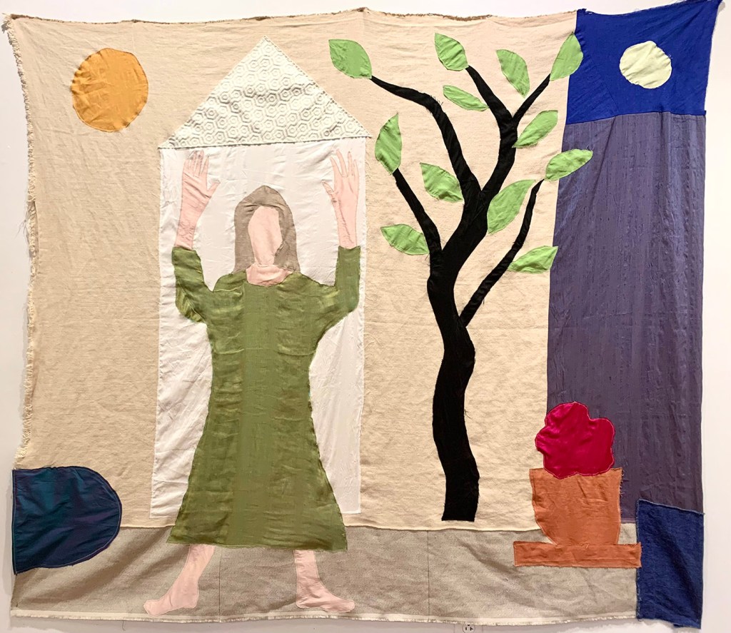“The Silken Tent, after Robert Frost”, acrylic on canvas, 60″ x 116″, 2025“The Spinster”, acrylic on canvas, 48″ x 24″, 2025“Bliss”, textile collage with linen, silk, cotton, 56″ x 31″, 2025“She Is”, acrylic on linen, 40″ x 56″, 2025“La Sculpteure”, acrylic on canvas, 60″ x 48″, 2025“Woman In Blue”, acrylic on canvas, 57″ x 39″, acrylic on linen, 2025Installation views“Summer Song”, textile collage with linen, silk, hemp, 72″ x 64″, 2025“Filled with Light”, acrylic on canvas, 24″ x 24″, 2025“Still Life with Yellow Pitcher”, acrylic on canvas, 20″ x 24″, 2025“Italian Dream”, acrylic on canvas, 24″ x 24″, 2025“The Painter’s Repose, after Chagall”, acrylic on canvas, 24″ x 24″, 2022“X + Y”, acrylic and collage on wood, 24″ x 24″, 2012-25Installation view“Wise Woman”, acrylic on antique hand spun linen over wood, 11 1/2″ x 9 1/4″, 2025