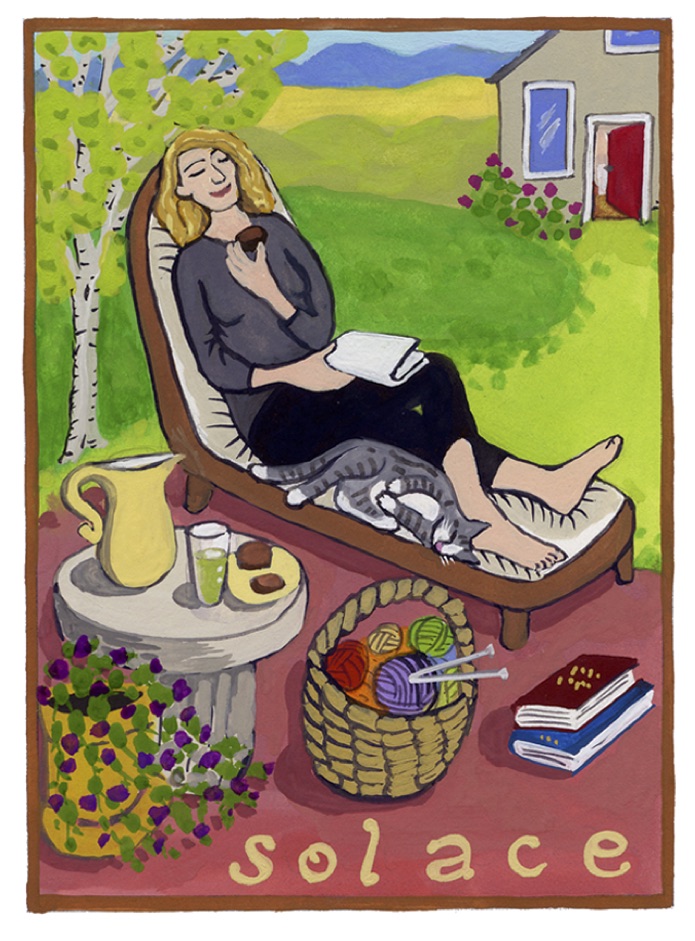 When I painted this image several years ago, I never thought it would be as relevant as it is today in our time of quarantine over the novel corona virus. I like to be alone and thrive on it but I know it is not the natural way for many people who are more extroverted. Still, maybe we can all use this time to be less productive and to just allow ourselves to really rest, indulge our simple pleasures, and soak up some sunshine if we are lucky enough to have it where we live. I did read that sunshine is effective to help heal if you are ill or to prevent illness, as the sun helps the body make vitamin D. I know we all have many concerns now, but maybe we can just take solace in rest for now. Keeping ourselves healthy is a great service to all.