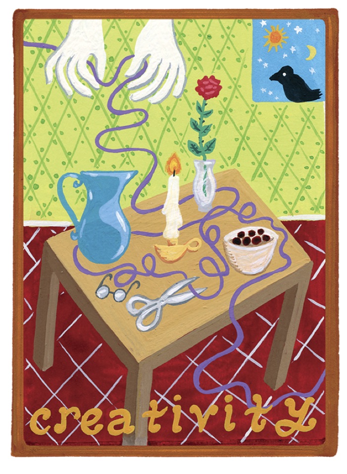 In this image, the objects on the table represent the four elements: earth, air, fire, and water. The spectacles signify our acute vision in the creative process, and the scissors signify that each creative act has a beginning, a middle, and an end. The purple ribbon is the web of energy flowing through everything, and the “helping hands” represent our innate ability to be in the creative process, our human ingenuity. Out the window, the sun and moon are the balance of active and passive forces, and the bird represents the soul’s wisdom that guides the process.
