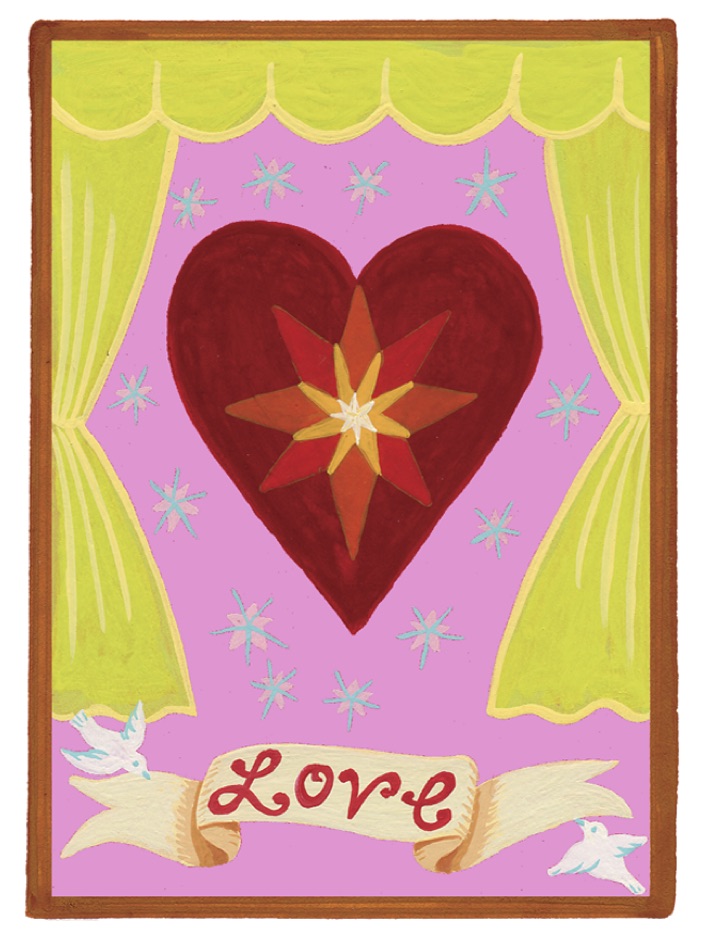 In this image, the heart is lit from within, not for any particular reason or for another person, but simply because the heart is full of love. A heart that is full of love feels love always and demonstrates love in all directions. The heart reveals itself to the world. The curtains of the stage are opened and the heart is humble but fearless because it has love within, which makes all else possible.