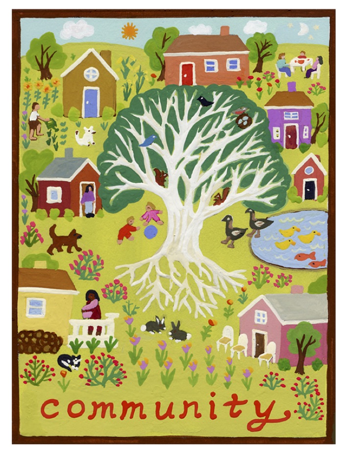 I wrote the following paragraphs about “Community” a year or more ago. It is ironic now in the time of social distancing that the coronavirus has caused us to practice that by staying apart we are helping each other to be healthy. We are really getting some good lessons about community by having it turned inside out like this. I personally am so grateful for the healthy and loving energy of the community in which I live. The worst has brought out the best in many, still I desperately miss the simple daily interactions with others that are gone for now. I’m glad to live around so many caring people who are helping each other in so many ways and I hope that we can all work to overcome the huge imbalances in our national and global communities that this pandemic has revealed in such stark detail. Let us use this opportunity to build healthier communities on all levels.