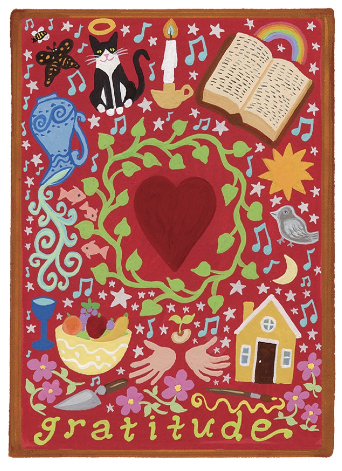 In this image, the heart is at the center pouring forth its loving warmth. All around it, in a circle, are emblems of some of the many things to be thankful for, including angelic animals, birds and bees, music, language, the elements of air, earth, fire, water, home, hands, tools for hands to use, and vessels to hold what is dear to us.