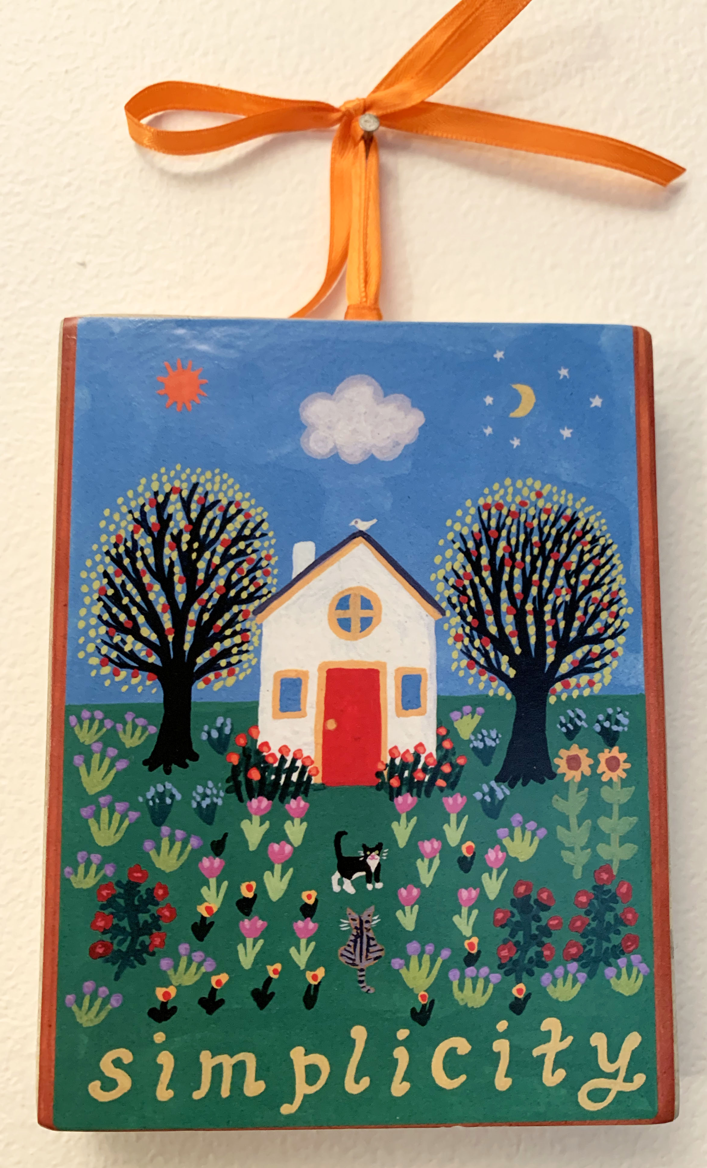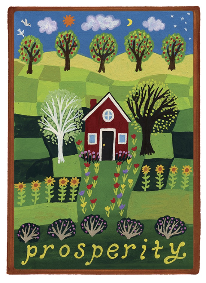 Simplicity is the quality of being uncomplicated, of taking things to their most basic and pure way of being. In this image, the house provides a container for the self, a safe place where the self can unfold. The simple structure of a house with four walls and a pointed roof is like a basic foundation or building block that occurs over and over in nature; it is solid and stable. Here the house is flanked by two trees, the sun and moon, flowers, animals, and all the elements of a peaceful summer day.